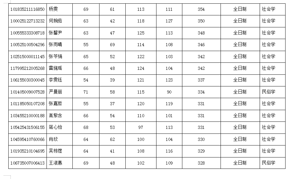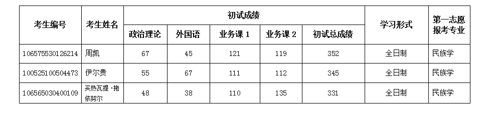 根据《民族学与社会学学院2025年硕士研究生招生调剂公告》,我院在2025年4月8日0时—4月8日14时开放调剂系统,根据考生初试专业与调入专业相同优先原则、相近专业依据相近程度依次遴选原则确定调剂复试考生。相同专业为“民族学”(0304)专业,相近专业及遴选顺序为“社会学”(0303)专业、“中国史”(0602)专业、“世界史”(0603)专业、“考古学”(0601)专业、“马克思主义理论”(0305)专业、“政治学”(0302)专业。确定初试专业的依据为专业代码前四位。在同一专业内,依据考生考试成绩排序,总成绩相同时以统考科目(政治、英语)总成绩排序。现将调剂考生进入复试名单公示如下: