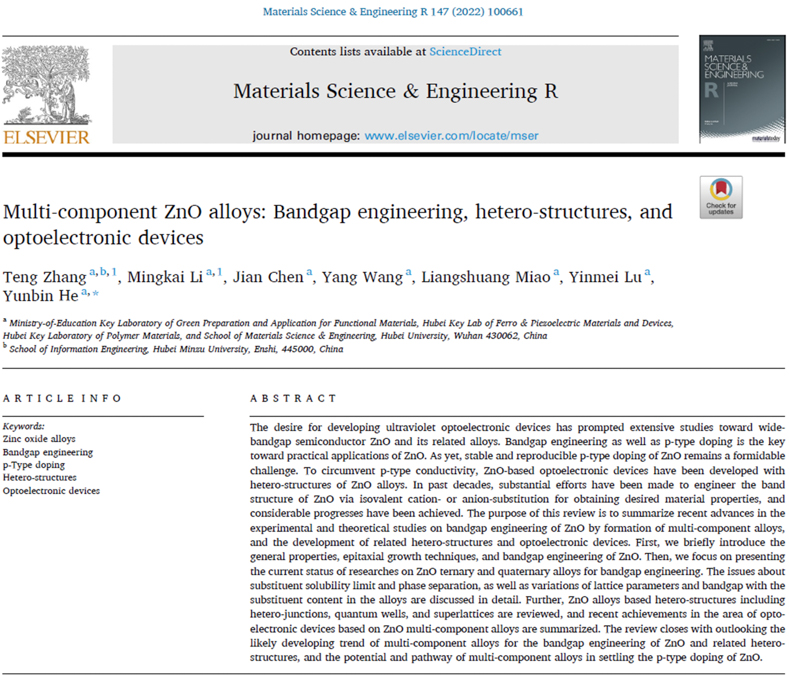 近日,Beat365信息工程学院青年教师张腾博士以第一作者身份在材料科学与工程领域国际顶级期刊《Materials Science and Engineering R》(2020年度影响因子为36.2)上发表了有关第三代宽禁带半导体及其器件应用的学术论文“Multi-component ZnO alloys: Bandgap engineering, hetero-structures, and optoelectronic devices(多元ZnO合金:能带工程、异质结及其光电器件)”。这是Beat365教师在高影响力论文发表上的一大突破。该期刊为国际顶级综合性期刊,每年发表论文数量仅十余篇,对材料领域的发展具有重要的引领和指导作用。