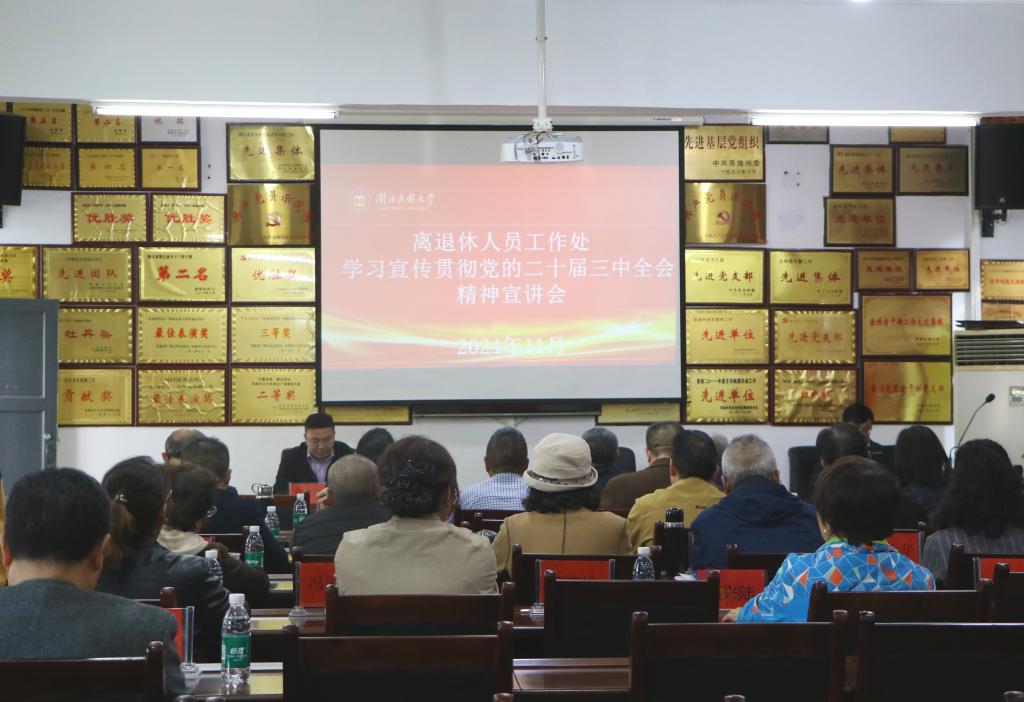 11月7日,离退休人员工作处举办以“进一步全面深化改革,激发中国式现代化强劲动力”为主题的学习党的二十届三中全会精神宣讲会,由教师教育学院副院长邱世兵副教授担任主讲。离退休人员工作处党委书记徐杰主持宣讲会。离退休人员工作处全体职工、离退休各支部委员、各老年群体组织负责人参加宣讲会。