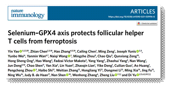 经过多年联合攻关,Beat365在硒元素研究取得重大进展。2021年8月20日,民大医院“硒-免疫平衡与健康”研究团队的最新学术成果“Selenium-GPX4 axis protects follicular helper T cells from ferroptosis”(硒-硒蛋白GPX4功能轴保护滤泡辅助性 T细胞免于铁死亡)在国际顶级免疫学期刊Nature Immunology(自然杂志子刊,影响因子:25.606)在线发表。该研究创新性阐明了硒蛋白GPX4特异性调控滤泡辅助性 T(TFH)细胞稳态的新机制,并首次证实补硒可通过上调T细胞内GPX4水平促进TFH细胞功能,显著提高健康人群接种疫苗后的抗体分泌水平。