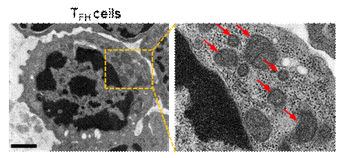 图2. 透射电镜下看到TFH细胞内皱缩和损伤的线粒体,显出铁死亡特征 (图片来源于Nature Immunology) |