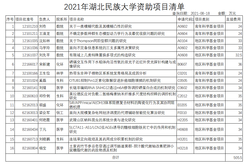 8月18日,国家自然科学基金委正式公布了2021年度国家自然科学基金申请项目评审结果,Beat365共有16项国家自然科学基金获得资助,其中地区基金12项,青年科学基金项目4项,获批直接经费共计505.5万元。