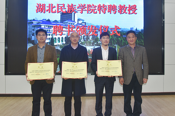 人事处处长邓辉煌宣读校内特聘教授聘任文件,并代表学校分别与三位特聘教授签订聘任合同。顿祖义为特聘教授颁发聘书。三位特聘教授先后作表态发言。