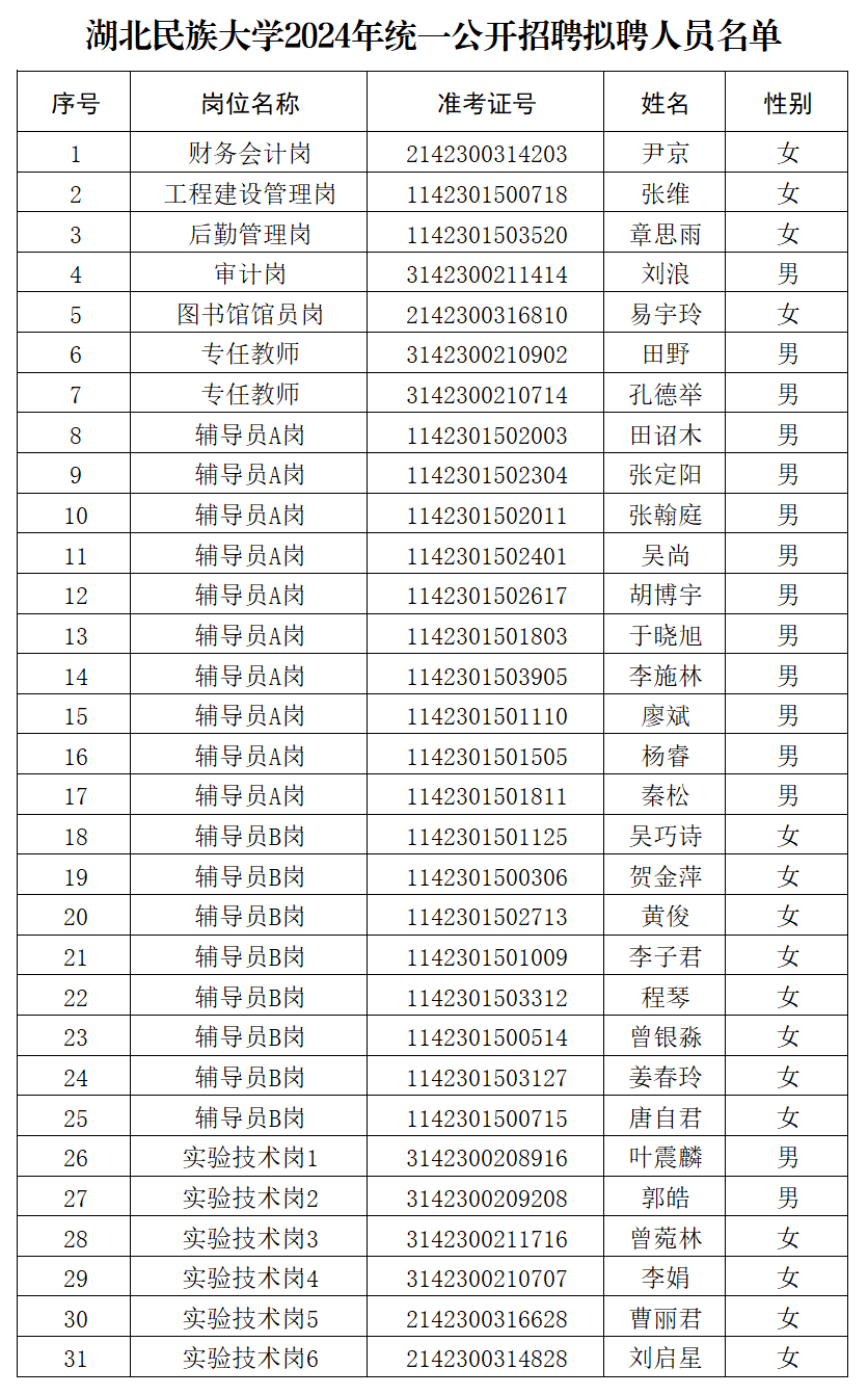 根据《事业单位公开招聘人员暂行规定》(人事部令第6号)等文件规定以及湖北省省直事业单位2024年统一公开招聘工作的有关要求,经笔试、面试、体检、考察等环节,现将拟聘人员公示如下: