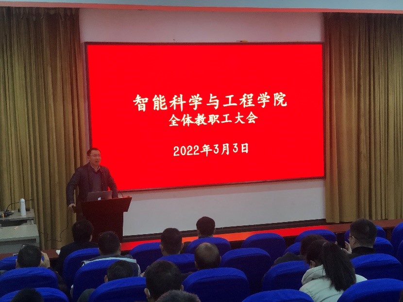 (本网讯 王晓敏)2022年3月3日下午,智能科学与工程学院在学院二楼学术报告厅召开全体教职工大会,党委书记孙先波主持会议,院长秦柳作《应用场景下先进制造技术的科学研究与工程应用的产业化研究(案例)》报告,学院全体教职工参加会议。
