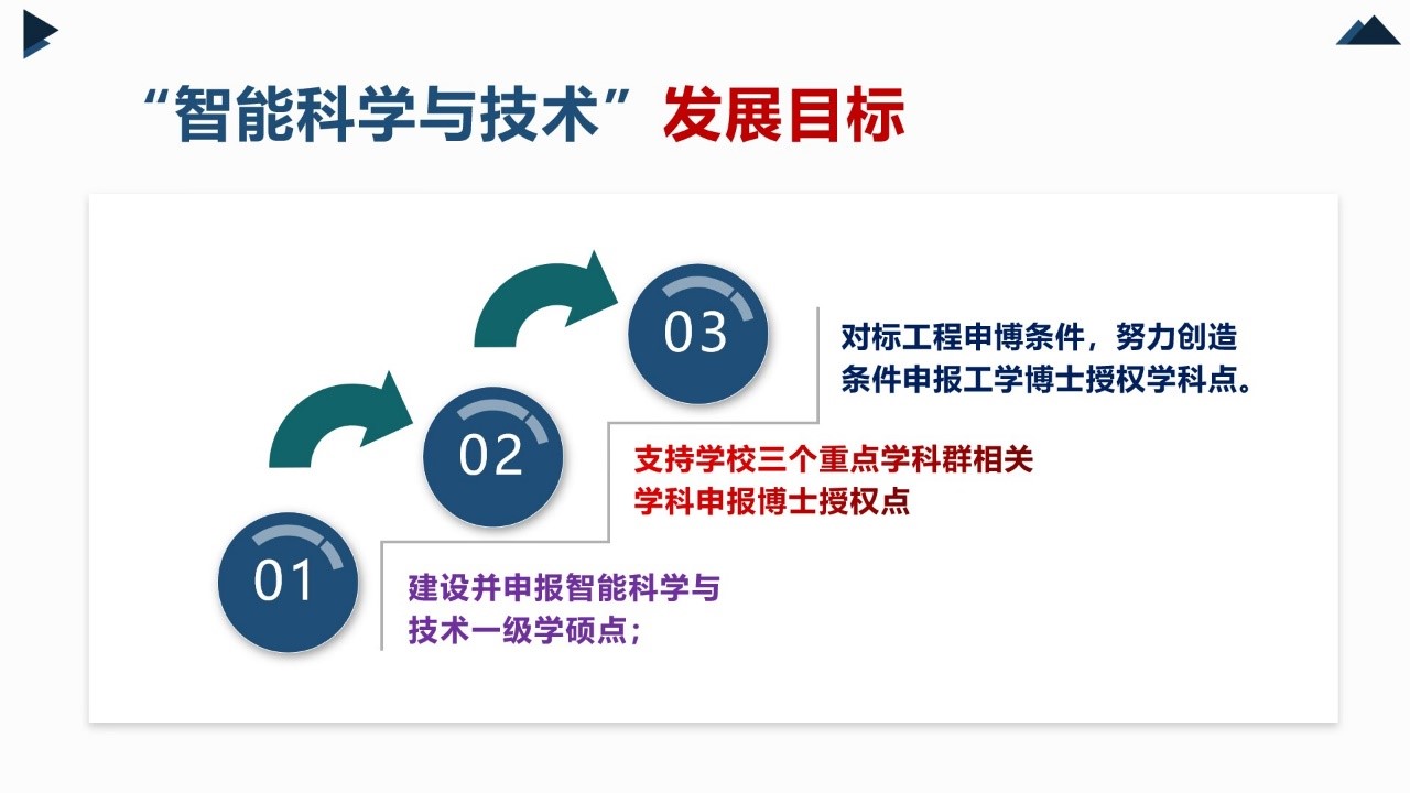 报告强调,学院未来将围绕重点发展的一级学科进行专业设置、人才引进、资源配置,平台建设,创优势、创特色,为地区产业转型升级提供强有力的支撑,奋力实现智能科学与技术重点学科发展的“三步走”目标。