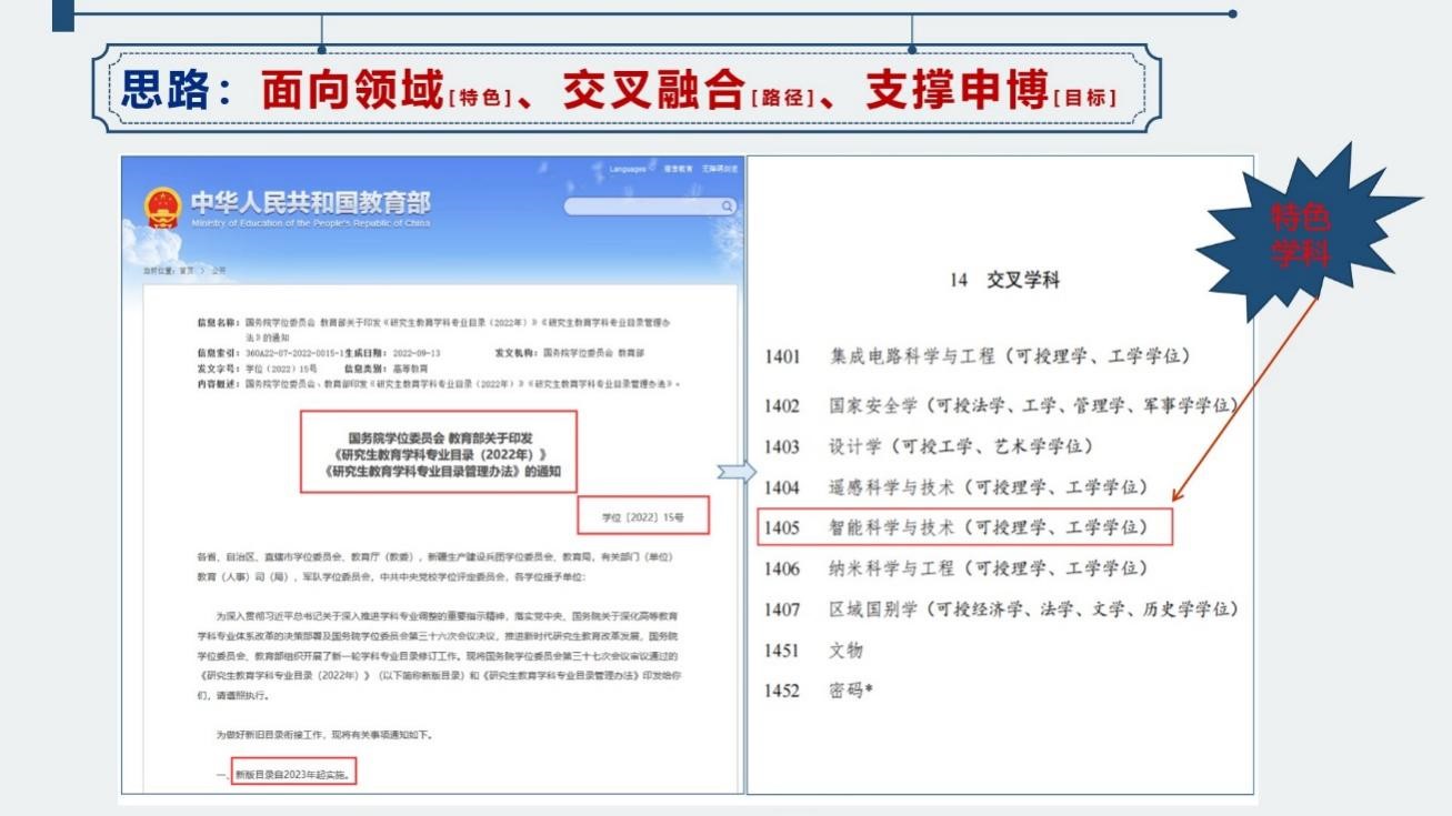 报告全面解读了学科规划的基本思路、学科设置与生态、发展基本路径、发展目标等内容,确立智能科学与技术(1405)这个交叉学科作为学院牵引重点学科。报告指出,“新工科”建设是引领中国高等工程教育改革的重要举措,是适应新技术、新产业、新经济交叉发展的战略需要,是推动实现学校高质量发展的重要支撑,更是学院长远发展的必然要求,重点发展的学科要有牵引作用,覆盖学院的学科专业,也必然要走交叉融合的发展路径。