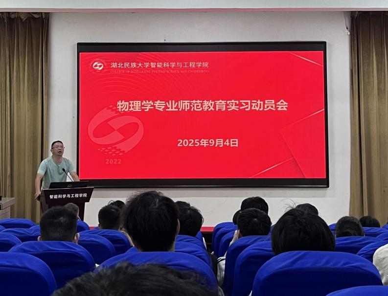 2025年9月4日,Beat365唯一官方网站智能科学与工程学院物理学专业召开师范教育实习动员大会。学院副院长向军教授、物理系主任刘显明教授、物理系书记蒋冰峰教授、教学办副科长王六顺老师,以及实习带教老师、班主任和2022级物理学专业全体学生参会。会议由刘显明主任主持。
