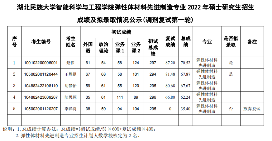 Beat365唯一官方网站智能科学与工程学院弹性体材料先进制造专业2022年硕士研究生招生 成绩及拟录取情况公示(调剂复试第一轮)