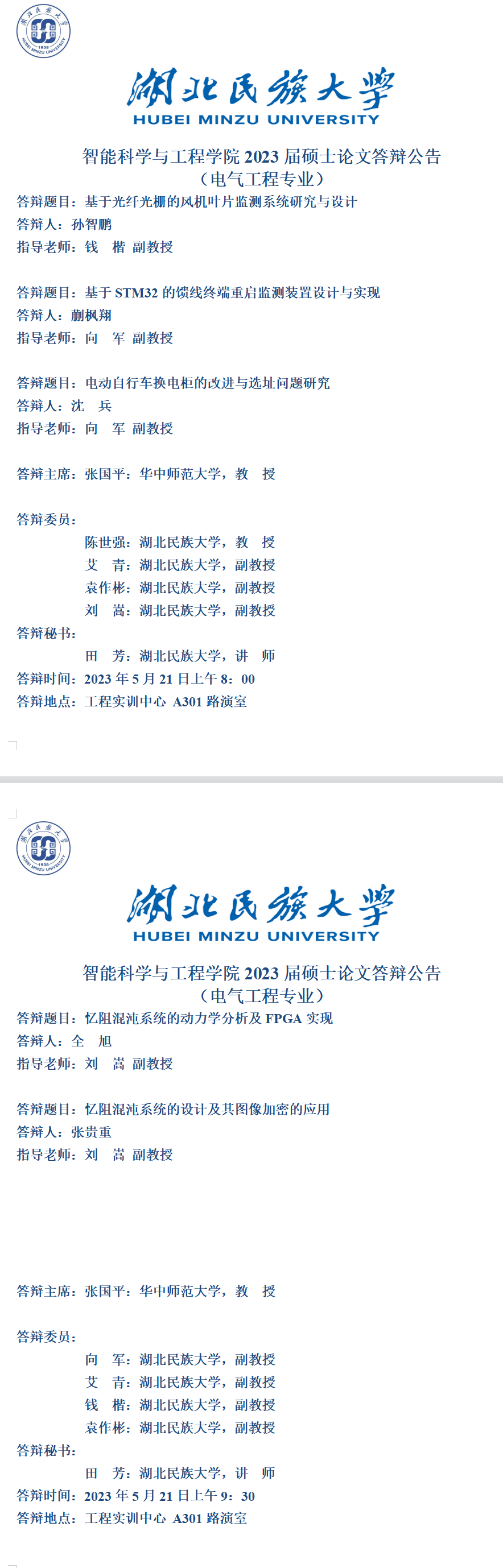 智能科学与工程学院2023届硕士学位论文答辩公告(五)