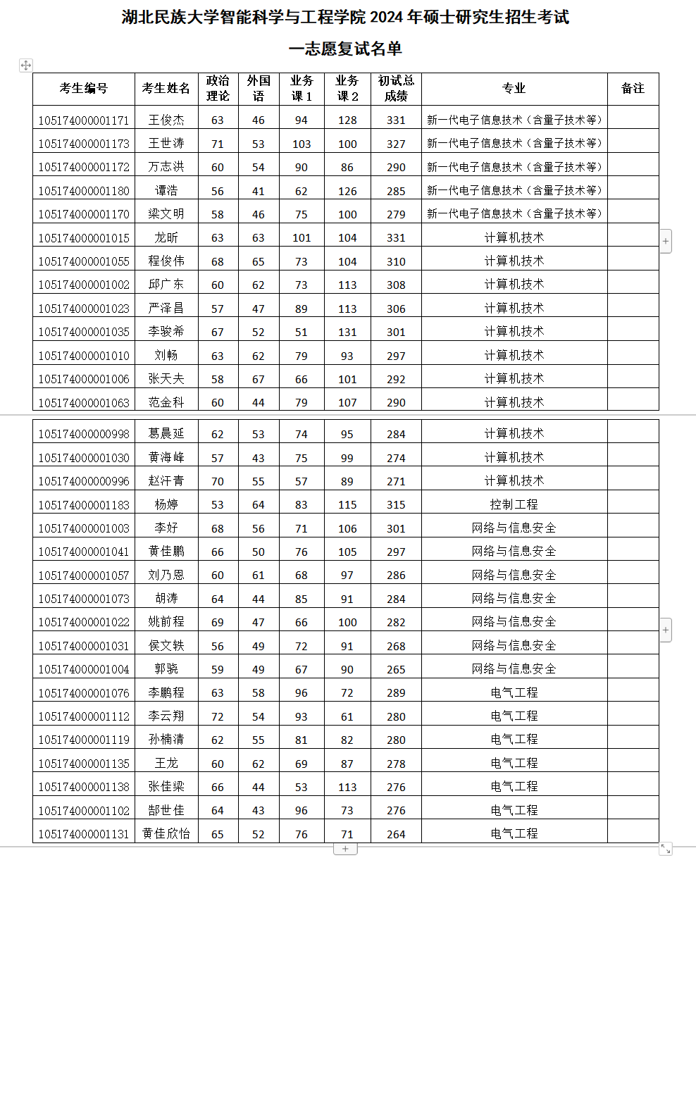 Beat365唯一官方网站智能科学与工程学院2024年硕士研究生招生考试一志愿复试名单