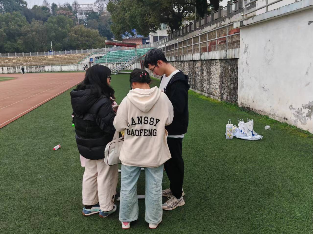 “手链匠心,绘织梦园”活动要求参与的同学在规定的时间内制作手链,同学们可以依自己喜好手工编制赋有美好祝福的饰品;“巧手智取,娃娃归心”活动以“圈娃游戏”作为最终目标,同学们会依次参加模仿秀、快速作画接力、知识竞赛等小游戏来获取套圈,最后用持有的套圈去套取心仪的玩偶;“足迹绘梦,跳跃童年”活动灵感源于童年时期的“跳房子”游戏,同学们在提前布置的场地上用粉笔在画布上描绘一幅房子,依音乐的节奏向规定的路线跳跃。活动现场气氛热烈、高潮迭起,掌声、笑声、欢呼声此起彼伏。