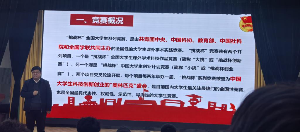 此次培训会吸引了众多对创新创业充满热情的学生参与,现场气氛热烈。 培训会上,校团委马宏飞老师首先介绍了挑战杯的基本情况。挑战杯作为大学生课外学术科技活动中一项具有导向性、示范性和群众性的创新创业竞赛活动,由共青团中央、中国科协、教育部、中国社科院和全国科联共同主办,在大学生群体中具有极高的影响力和权威性。马宏飞老师着重强调,今年的挑战杯主要以科技竞赛为主,同学们务必提前准备好参赛作品。他详细说明了时间节点:4月份进行报赛,5月上旬要完成通讯评审的准备工作,6月15号将迎来国赛评审。这一系列时间安排,提醒着同学们要合理规划时间,精心打磨作品,确保在各个阶段都能出色完成任务。