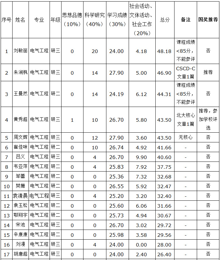 信息工程学院2018年研究生国家奖学金评选成绩公示如下,综合考虑国家奖学金评定条件,拟推荐朱涧枫、黄秀超参加学校国家奖学金评选。 公示时间2018年10月15日-10月20日,公示期内有任何异议,可向学院奖学金、助学金评定委员会或学科建设科反映,联系人:马大柱,联系电话0718-8439993。