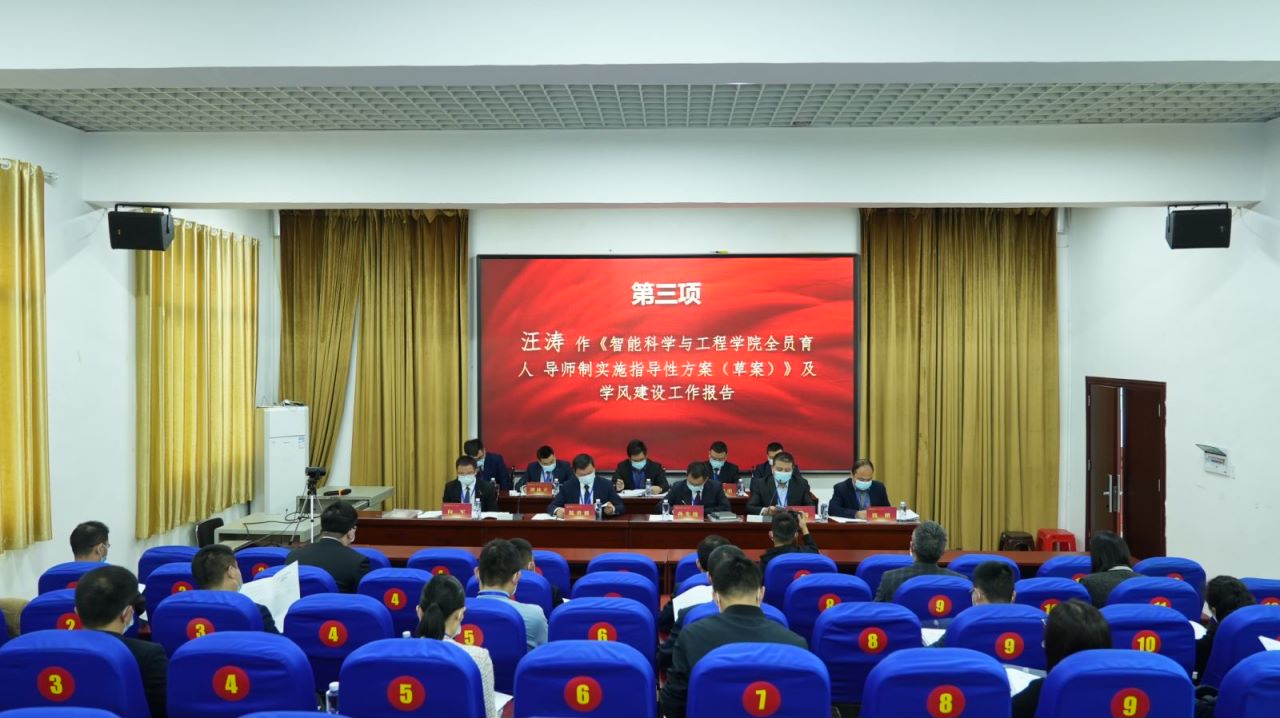 汪涛书记作《智能科学与工程学院全员育人、导师制实施指导性方案(草案)》及学风建设工作报告,本方案提出实施导师制,工作目标为实现管理与育人、育人与教育相结合,他表示导师制是帮扶学生学习的好方法,提升家校共建的好桥梁;副院长向军作《智能科学与工程学院2022年年终绩效分配方案(草案)》报告,明确按劳分配、优绩优酬基本原则,向做出突出业绩人员、一线教师倾斜,同时统筹考虑教学、科研、管理等各岗位绩效分配,促进学院建设全面协调发展;副院长钱楷作《智能科学与工程学院专任教师赴企业开展科研工作实施办法(草案)》工作报告,引导专任教师赴企业开展应用型科学研究和科技服务,提高教师实践水平,加强学院“双师型”教师队伍建设,为新时代培养更多优秀的应用创新技术人才。