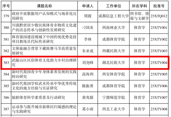 9月27日,根据全国哲学社会科学工作办公室《2023年国家社会科学基金西部项目立项结果公布》的通知,我院教师刘尧峰博士申报的课题《武陵山区民俗体育文化助力乡村治理研究》获批立项资助,项目批准号:23XTY004。