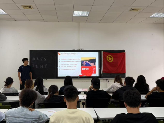活动中,张坤峰同学通过讲解国家安全的相关知识及播放视频,为同学们生动展示了网络安全、生态安全等多个领域的国家安全知识。随后,同学们围绕“大学生如何维护国家安全”等话题展开讨论。严全同学结合危害国家安全的行为,从大学生视角出发,分享了增强国家安全意识、遵守法律法规、保护生态环境等维护国家安全的切实可行的措施。