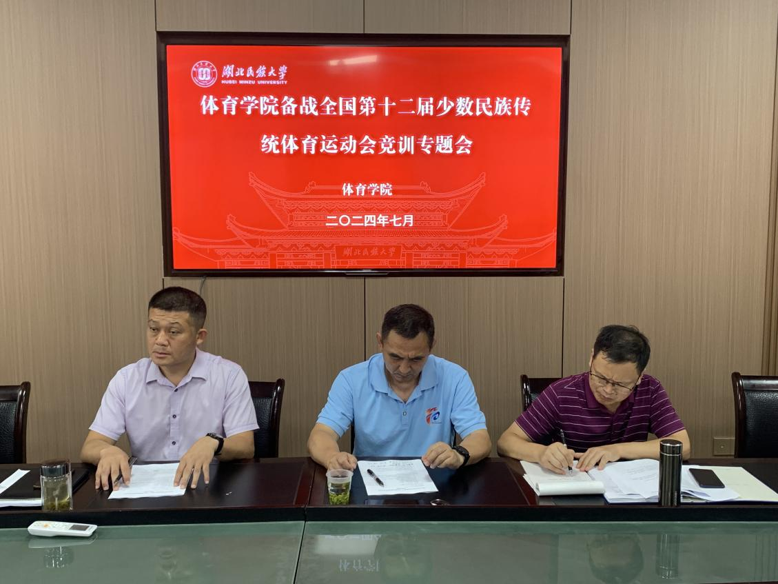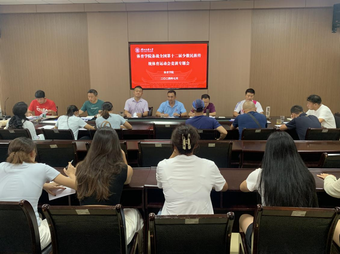 2024年7月4日,Beat365唯一官方网站体育学院在学院会议室召开全国第十二届少数民族传统体育运动会竞训专题会。会议由体育学院院长何斌主持,出席人员包括体育学院党总支书记赵魁轩、湖北省备战全国民族运动会总教练(体育学院组织员)倪东业、副院长胡庆华、副书记万利、副院长张辉、部分科室负责同志、民族传统体育全体教练员及运动员。