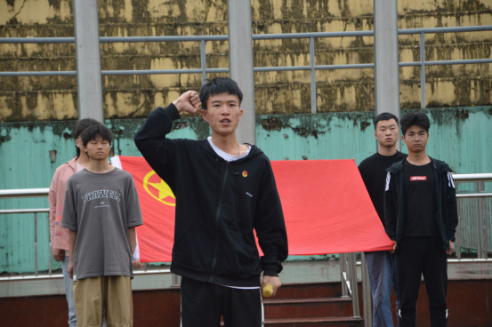 活动第一项:出旗,国旗护卫队迈着铿锵有力的步伐走向升旗台。活动第二项:升国旗、奏国歌,全体师生怀着崇敬的心情,注视着五星红旗徐徐升起。活动第三项:出团旗,全体团员齐唱团歌《光荣啊,中国共青团》。活动第四项:全体团员面向团旗,由团员代表体育学院冯圣元同学领誓,全体团员重温入团誓词。