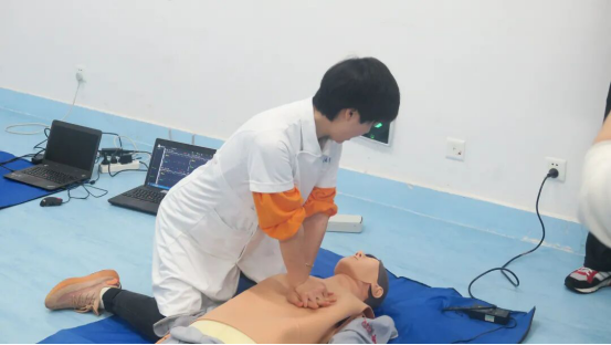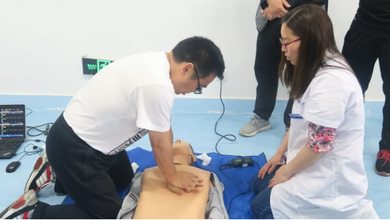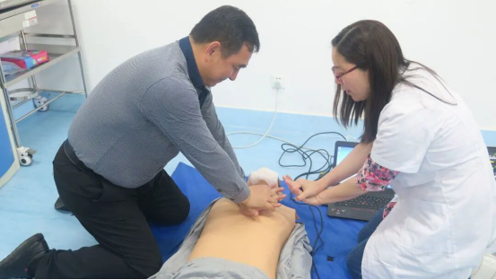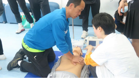 教学伊始,民大附属医院肾病内科的谭伟宁、张明霞,以实践操作的方式展开,详细地为老师讲解如何调整体位、打开气道、判断呼吸、人工呼吸、胸外心脏按压等急救法,同时老师们也进行了实地演练,感受了整个急救过程,同时医生提出在急救过程中的两点注意事项以及动作要领。