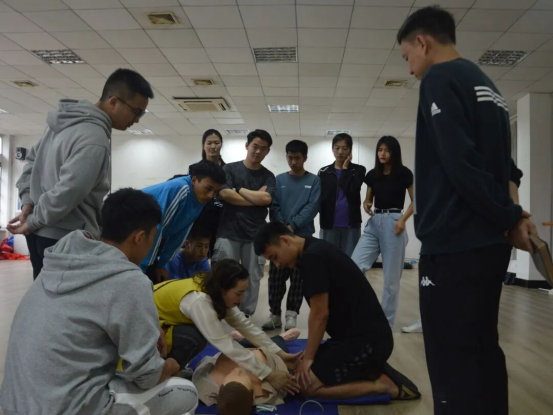 随后由民大附属医院急诊科李明春教授,医生胡筱、张荣、谭靖从心肺复苏、溺水现场急救、创伤现场急救原则和外伤与出血的现场急救这四个方面来讲述,给同学们做出急救示范并且讲解要点,让同学们清晰了解包扎的动作和方法,还告诉了同学们现场急救的七大步骤现场急救