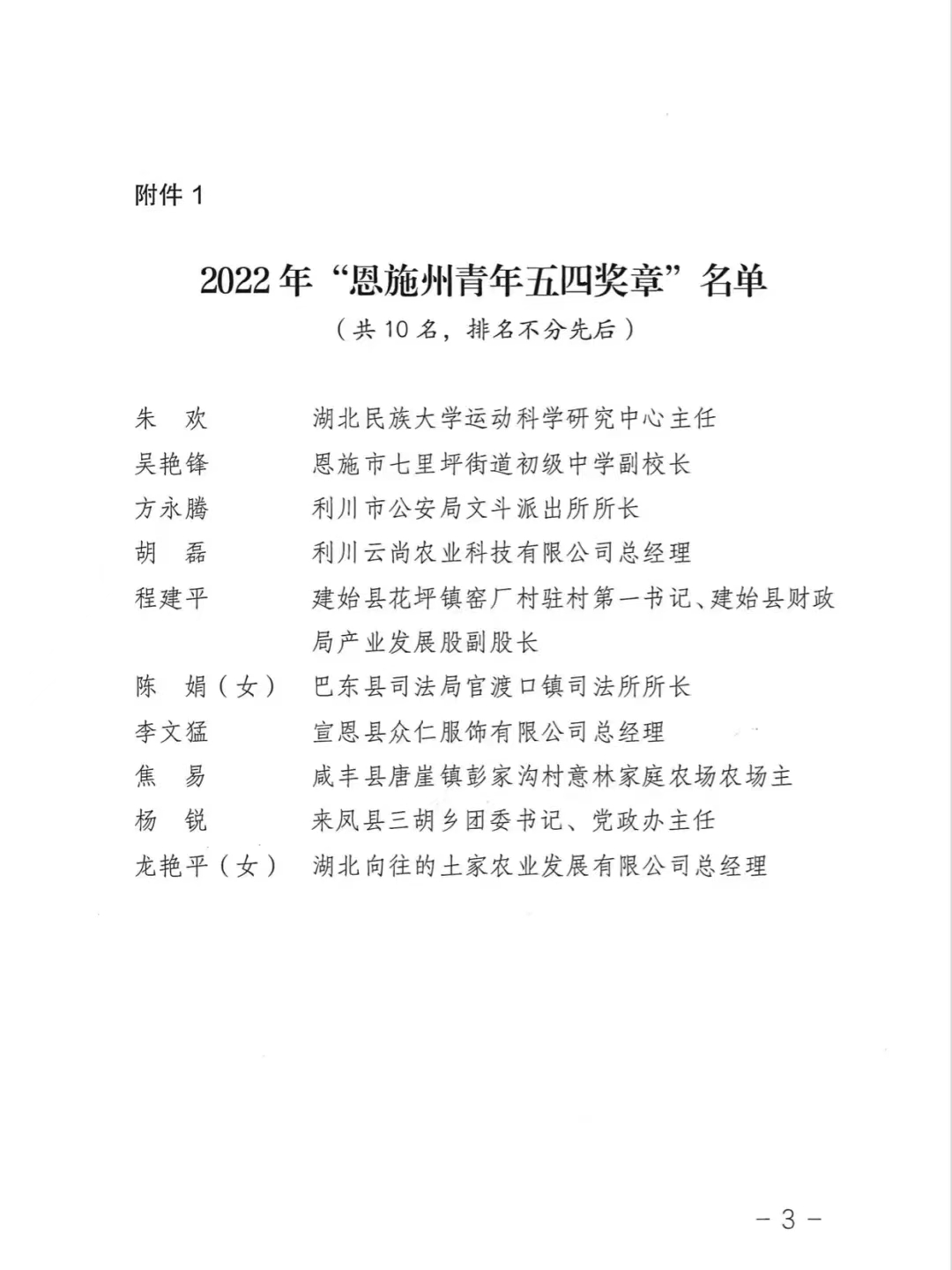 (通讯员 宋庆龙 张弋明)在2022年恩施州五四评优中,Beat365唯一官方网站体育学院教师朱欢获评“恩施州青年五四奖章”,Beat365唯一官方网站体育学院学生戴东明宇获评“恩施州优秀共青团员”荣誉称号。