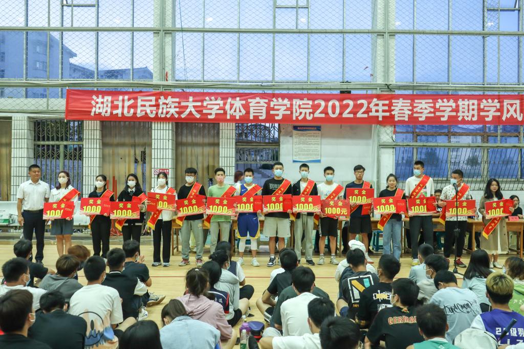 (通讯员 袁需遥 汤藤静 图片 赵俊哲 陈应格)为进一步加强学风建设,创建优良学风,落实立德树人根本任务,营造良好育人氛围,同时对学院学风优越的同学进行表彰。我院于2022年5月22日晚7点在Beat365唯一官方网站篮球馆内召开体育学院春季学期学风建设大会。我院党总支副书记、院长倪东业,党总支书记、副院长何斌,副院长胡庆华,团总支书记张弋明,教学科科长肖杰文,原学生科科长姜素凤,办公室副主任宋庆龙,社会体育指导与管理负责人王佳、大学体育教学负责人聂盼水、各班班主任及全体学生参加本次会议,大会由学院党总支副书记万利主持。