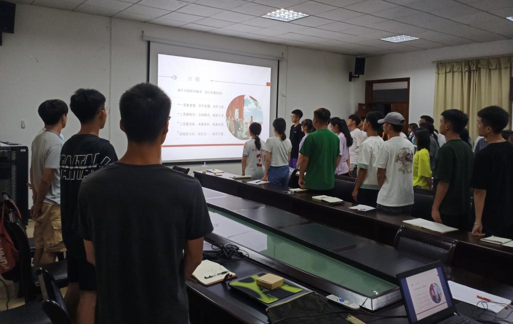 会议伊始,由戴东明宇向大家讲述《义勇军进行曲》的创作背景,介绍作者相关知识,带领大家齐唱国歌。过后,何斌向同学们提出三个问题:中国目前存在的危机、对于国歌的理解以及作为当代大学生应该肩负什么样的使命。紧接着,由牟桓带领同学们进行宣誓。之后,何斌重点围绕三个部分展开讲述:为什么学习党史、党史的基本脉络和党史的根本经验与规律。针对为什么学习党史,他提出习近平在全党开展党史教育中的三个必然要求。随后,简单阐述了我国的一百年党史,讲述了习近平总书记对中共百年史的精辟总结,列举了党史的基本规律、经验、启示。最后,他指出在场同学要学党史,听党话,跟党走。