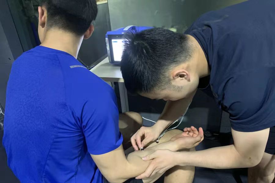 朱欢使用微循环仪器监测钢架雪车运动员身体机能状态
