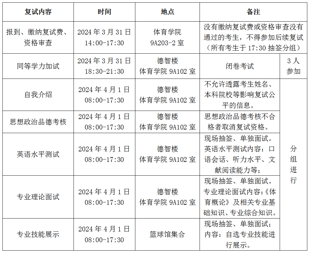3.复试内容及录取办法参照《Beat365唯一官方网站体育学院2024年硕士研究生招生复试录取工作细则》执行。