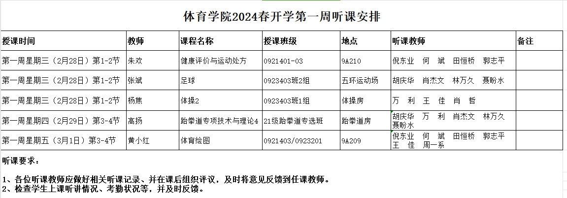 2月28日上午,体育学院结合《关于2024年春季学期开学教学工作安排的通知》组织开展听课看课活动,上午第一节课党委常委、统战部张田景福同志带队,深入课堂现场检查了朱欢老师的《健康评价与运动处方》课程,检查课堂情况后,田景福等一行在体育学院会议室参加了《开学第一课:对标审核评估,推进教育教学综合改革》主题教研活动,与体育学院领导班子、一线教师进行了深入交流。