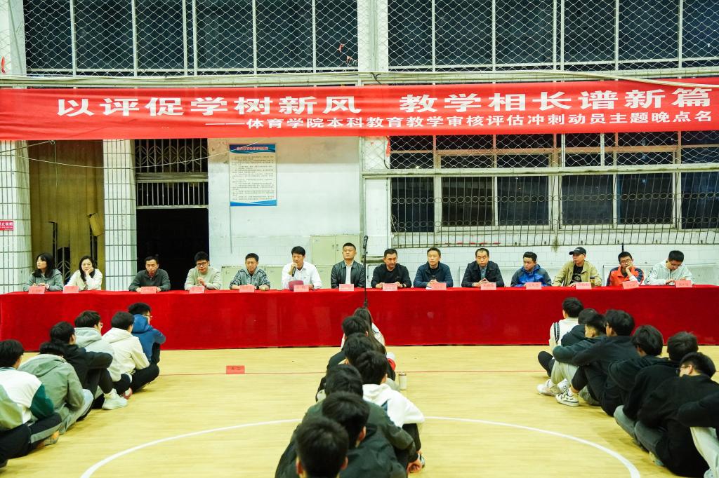 为进一步推进学风建设工作,真正树新风、展新貌、开新局,推动我院教学质量迈上新台阶,同时营造良好的迎评氛围,确保评估工作顺利进行,4月7日晚,我院特开展本科教育教学审核评估暨师范专业认证冲刺动员主题班会。我院领导班子、各科室负责人、各班班主任及大一、大二、大三全体学生参加会议,体育学院党总支副书记万利主持会议。