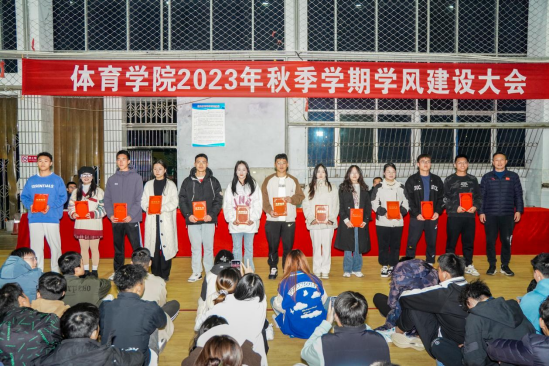 会上,胡庆华宣读《体育学院关于通报表扬2022-2023学年度和2023年秋季学期优秀个人及集体的决定》,在学生群体中树典型、奖模范,对本学年我院通过四六级考试、在各类学科竞赛中取得佳绩及综合测评中名列前茅的同学进行表彰,以此弘扬优良学风,引导其他同学向模范看齐,朝着自己的人生目标不断奋进。