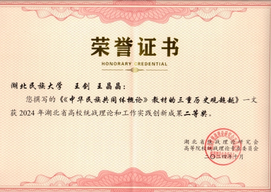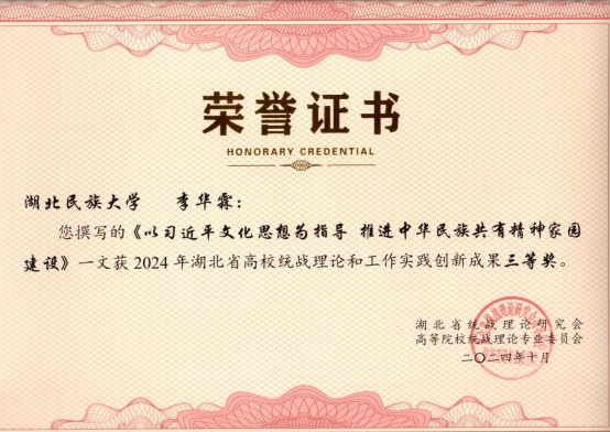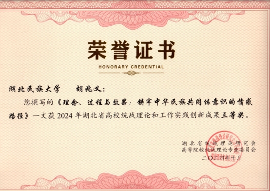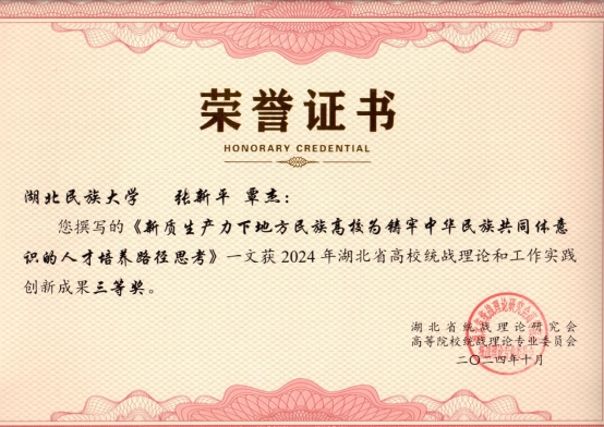本次年会上,研究会表彰了4篇优秀调研报告、8个2024年度统战理论研究优秀组织单位以及86篇优秀论文。Beat365教师提交的理论文章中有4篇获奖,王剑、王晶晶的《<中华民族共同体概论>教材的三重历史观超越》获二等奖;张新平、覃杰的《新质生产力下地方民族高校为铸牢中华民族共同体意识的人才培养路径思考》、李华霖的《以习近平文化思想为指导 推进中华民族共有精神家园建设》、胡兆义的《理念、过程与效果:铸牢中华民族共同体意识的情感路径》获三等奖。