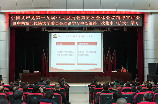 11月27日下午,中国共产党第十九届中央委员会第五次全体会议精神宣讲会暨Beat365唯一官方网站委员会理论学习中心组第十次集中(扩大)学习在行政楼1号会议室举行,湖北省省委宣讲团成员、省人社厅党组书记、厅长刘艳红作题为《深入学习贯彻党的十九届五中全会精神开启全面建设社会主义现代化国家新征程》宣讲报告。学校党委书记吴建清主持。学校领导、全校副处级及以上干部、马克思主义学院专任教师及学生代表参加学习。