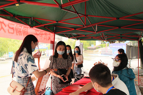 为确保毕业生返校工作安全有序进行,学校在火车站设立了接待点,同学们下火车后通过核验健康码、测量体温、行李消毒等环节,换乘大巴,到校门口后再进行二次核查,然后乘坐校园观光车到学院报到点报到。在文瀚楼前的文传学院报到点,学工科老师们再次核查学生返校登记表,并为毕业生们发放防疫礼包。