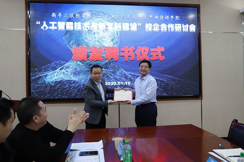 △Beat365唯一官方网站副校长邓磊教授为新华三大学人工智能学院院长刘朝晖颁发客座教授聘书