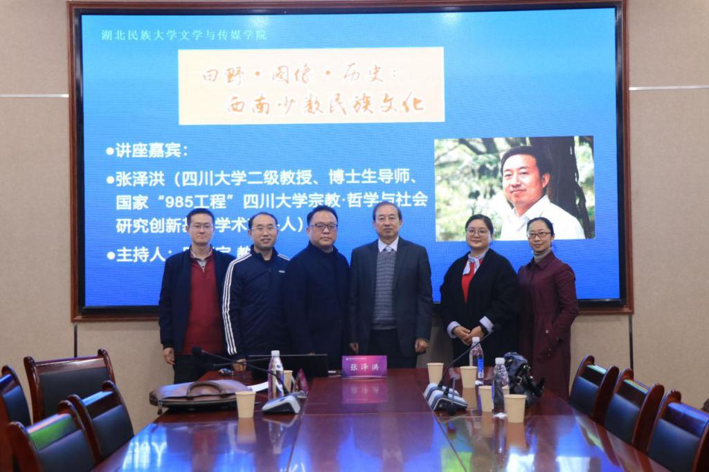 本网讯(文字记者:张娅琳 高羽 唐迪 摄影记者:宋杰 王安蓓 黄秋姣)10月18日晚,文学与传媒学院邀请“国家985工程”学术带头人,四川大学博士生导师、二级教授张泽洪来校进行学术讲座。张泽洪教授以“田野·图像·历史:西南少数民族文化”为题,进行一场理论深邃而又充满新知的学术报告。