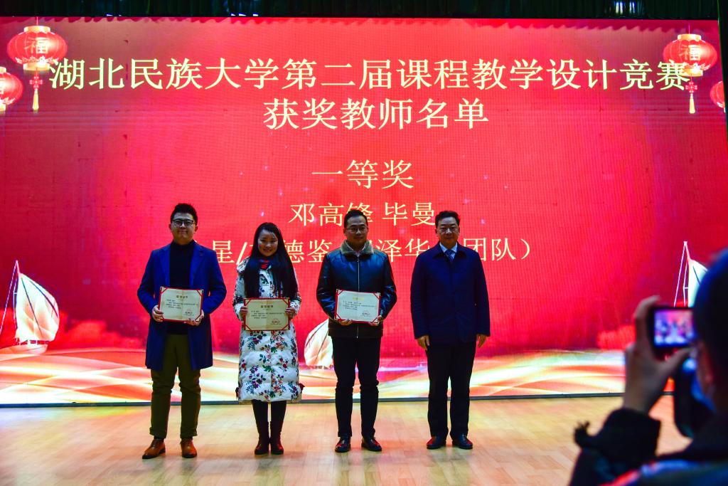 学校党委书记吴建清为获得一等奖的选手颁奖。我院青年教师邓高峰、毕曼获得课程教学设计组一等奖,杨旖旎获得课程思政教学设计组一等奖。