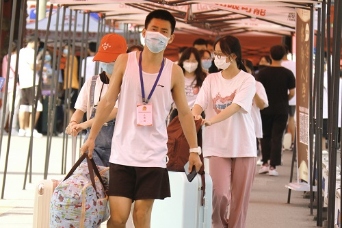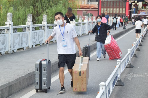 本网讯(记者 田忻 陆宇楠 李赵龙 周朦朦 钟薇依 时吟吟 张诗怡 陈雨捷 王婷 苏小梅 梅兰茜 赵瑞滢 宋小冬)云天夏渐暮,秋色正意浓。带着青春的活力,迈着轻快的步伐,文学与传媒学院2021级新生不远万里,怀着满腔热血与期盼步入校园,开启大学之旅。
