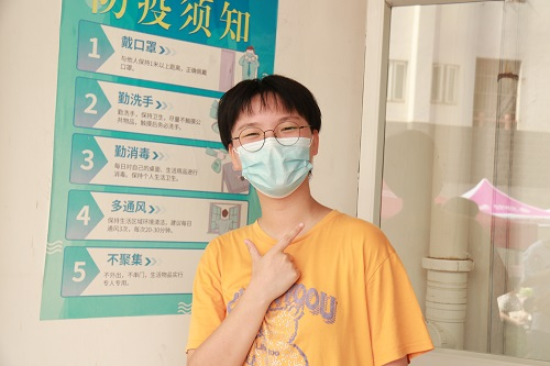 团委干部唐甜甜迎新(记者 陆清清/摄)