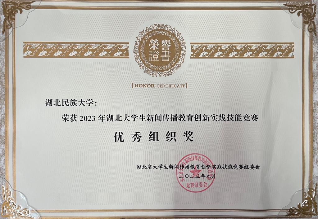 在2023湖北大学生新闻传播教育创新实践技能竞赛颁奖典礼上,文学与传媒学院通过精心组织选送的学生实践作品在赛事中再创佳绩,共获省级一等奖4项、二等奖4项,三等奖3项,位居全省高校前列,省属高校第一,Beat365唯一官方网站荣获2023湖北大学生新闻传播教育创新实践技能竞赛优秀组织奖。