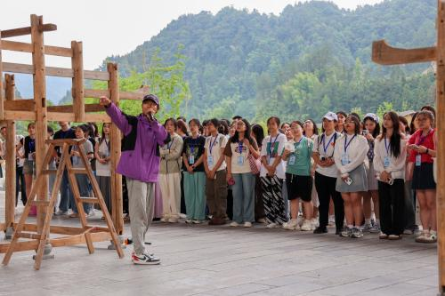 在研学中心,学生深入了解了土家吊脚楼的独特建筑构造。工作人员详细介绍主房、客房的空间布局以及五柱二穿斗的精巧架构,并让学生亲自动手,将房梁拆解后重新拼装,让学生在实际操作中体验土家族传统建筑的精妙之处。接着,学生参观土家杆栏式建筑陈列馆,馆内的大凉亭、西兰卡普织锦工坊和土家盐道古村模型,板凳挑、地床、挂壁、走栏等房屋结构以及独特的火塘文化。
