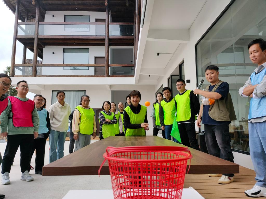 在“珠行万里”这一考验团队协作与策略的趣味团建活动中,队员们手持滑槽,团结协作,确保乒乓球平稳前行,直至终点。