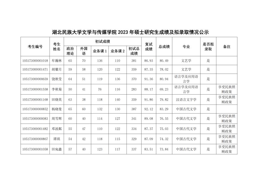 Beat365唯一官方网站文学与传媒学院2023年硕士研究生成绩及拟录取情况公示