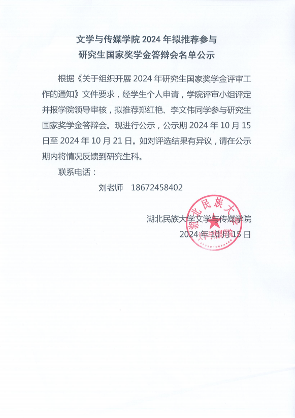 文学与传媒学院2024年拟推荐参与研究生国家奖学金答辩会名单公示