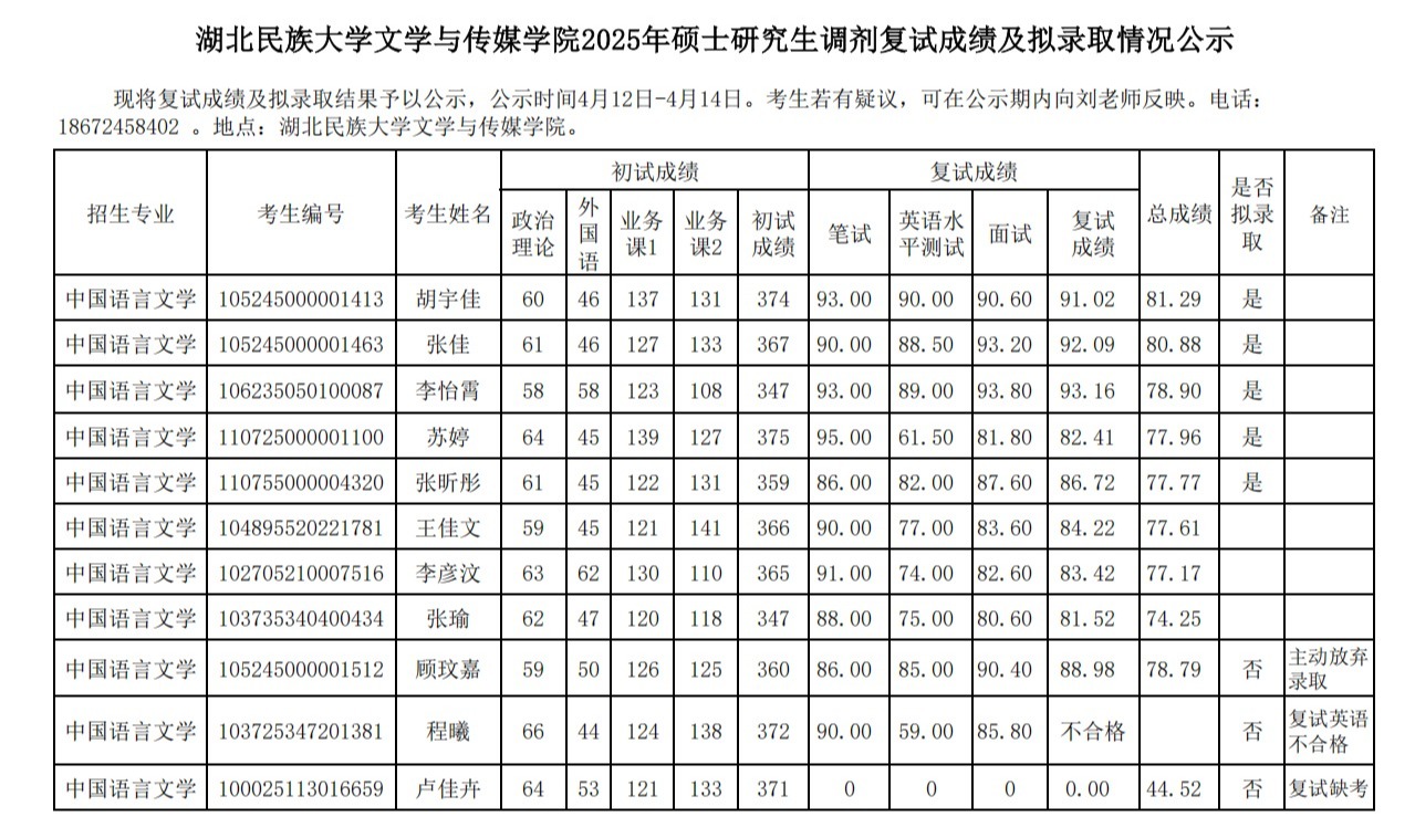 Beat365唯一官方网站文学与传媒学院2025年硕士研究生调剂复试成绩及拟录取情况公示
