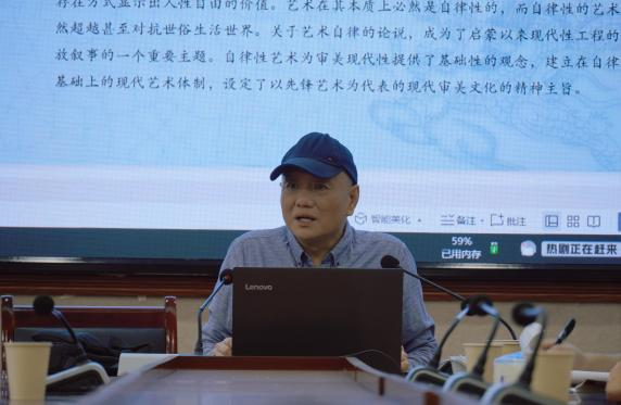 冯黎明教授围绕“走出前现代:从技能的技术到美的艺术”“作为一种现代信念的艺术自律”“艺术自律论的思想旅行”“审美伦理与形式游戏:自律性艺术大厦的两面山墙”、“通往先锋艺术之路”以及“中国艺术的自律性问题”六个方面与在座师生作了关于审美现代性的深入交流与探讨,阐释了“艺术之美”的发展与流变。冯黎明教授重点强调艺术的自律性问题,并结合西方学者关于艺术自律的批判性思想理念,分别从艺术场、艺术家、艺术体制三个方面论证了艺术自律何以作为一种现代信念。冯黎明教授认为,审美伦理是艺术自律论的价值设定,形式游戏则是自律性艺术的存在设定与创世功能,将艺术自律、审美伦理、形式主义与艺术史的协调统一,利于开拓通往先锋艺术之路。