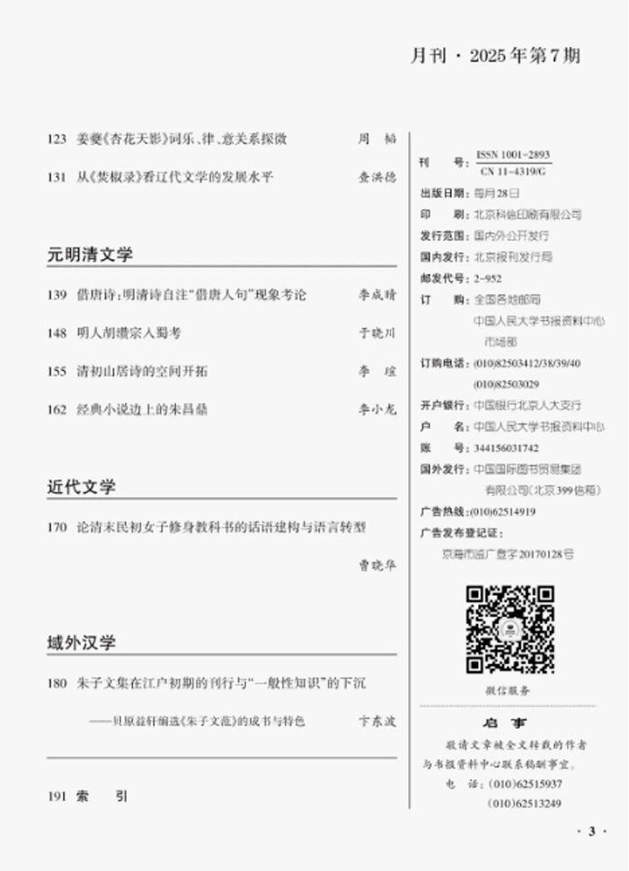 2025年第7期《人大复印资料·中国古代、近代文学研究》全文转载了我院周韬教授的文章:《姜夔<杏花天影>词乐、律、意关系探微》,此文原载于2025年第1期《中国韵文学刊》。