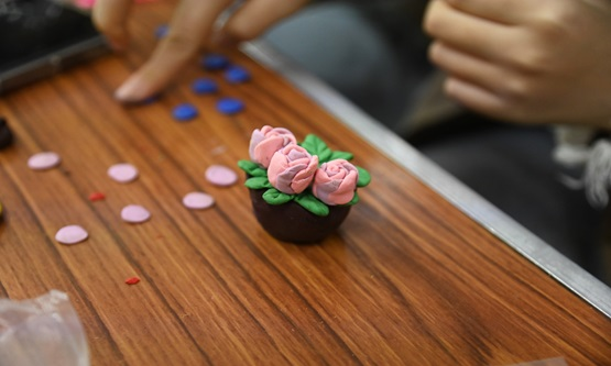 手动制作环节中,参与者神情专注,使用揉、捏、剪、挑、压、粘、贴等各种手法制作泥塑,将泥塑知识运用到实际制作中,体验中国传统文化和传统技艺的魅力,参与者发挥想象动手制作,现场气氛活跃有趣;作品展示环节中,菠萝吹雪、派大星、花篮……各式各样的泥塑作品被展示在讲台,参与者有序讲解手工泥塑,每一尊泥塑均被赋予不同意义,展现民大学子的心灵手巧。